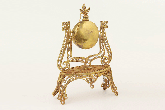 Container of gold with decorative kohl stick suspended from a gold filigree (targashi) stand.