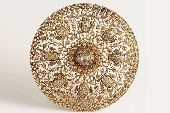 Hair Ornament Gujarat, Western India Late 18th / Eearly 19th century Fabricated from gold, the front worked in an exquisite filigree design, this disc like hair ornament is set with diamonds.