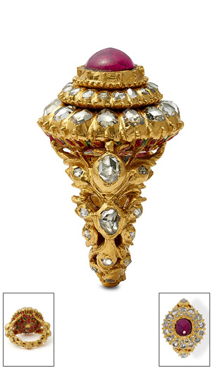 Ring Deccan, India 17th / 18th Century A large man's ring in gold, set with Golconda diamonds and a central cabochon ruby. This ring was probably made for a sultan or prince of the Deccan courts. Many Deccani paintings depict imperial personalities like Sultan Ibrahim 'Adil Shah II and Sultan 'Abu'l Hasan Qutb Shah, and even religious authorities, wearing such large rings as this one. |