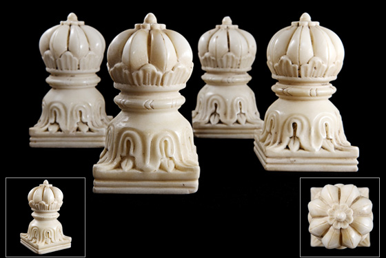 Carved from marble these carpet weights, known as mir-e-farsh were used to hold securely the light cotton and silk summer carpets that provided comfortable seating on marble floors in the hot summer months. Each carpet weight in the form of a dome stands on a square base covered with overlapping acanthus leaves, surmounted at the top by a flower-head finial. |