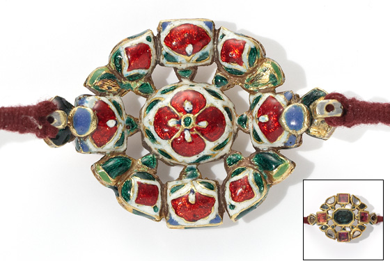 A pair of ear jewels, each in the form of an eight petal flower-head kundan-set in gold with table-cut diamonds in an open backed setting. Each ornament is suspended with a bell shaped enamelled and diamond set terminal with a fringe of pearls, each with a gold cap enamelled in red and a miniscule red bead at the bottom.