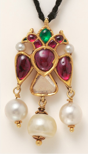 Fabricated from gold, set in kundan technique with cabouchon rubies, emerald and diamond, suspended with natural pearls.