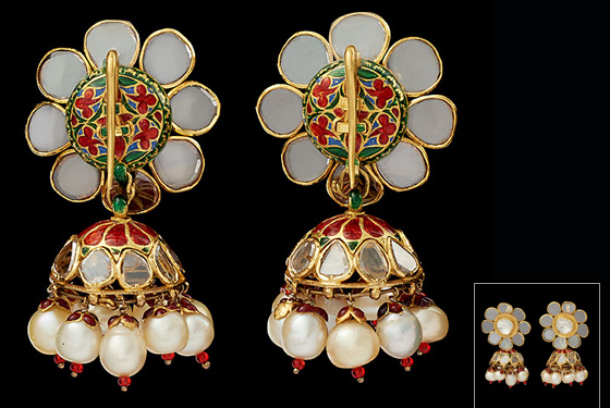 A pair of ear jewels, each in the form of an eight petal flower-head kundan-set in gold with table-cut diamonds in an open backed setting. Each ornament is suspended with a bell shaped enamelled and diamond set terminal with a fringe of pearls, each with a gold cap enamelled in red and a miniscule red bead at the bottom.