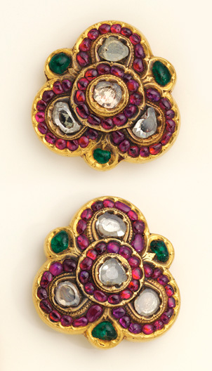 A pair of ear plugs Deccan, India 17th century Gold set with cabouchon rubies, emeralds and diamonds in a trefoil design.