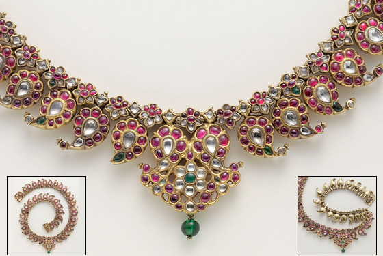 A mango (manga malai) necklace of gold set with Burmese Cabochon rubies, emeralds and white sapphires in mango shaped units. The mangos are held in sequence by flat chains that pass through loops behind each piece. The back is plain gold. |