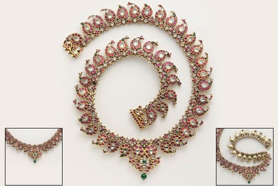 A mango (manga malai) necklace of gold set with Burmese Cabochon rubies, emeralds and white sapphires in mango shaped units. The mangos are held in sequence by flat chains that pass through loops behind each piece. The back is plain gold. |