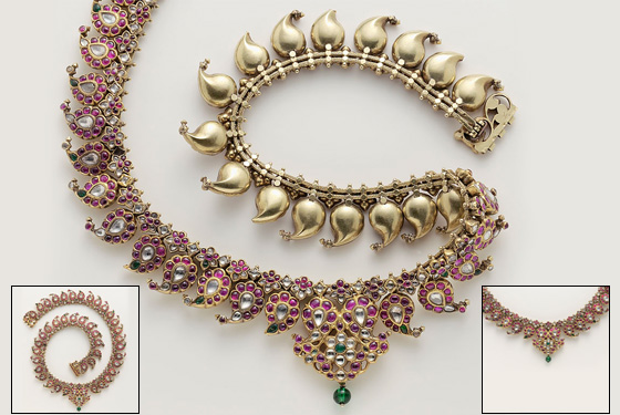 A mango (manga malai) necklace of gold set with Burmese Cabochon rubies, emeralds and white sapphires in mango shaped units. The mangos are held in sequence by flat chains that pass through loops behind each piece. The back is plain gold. |