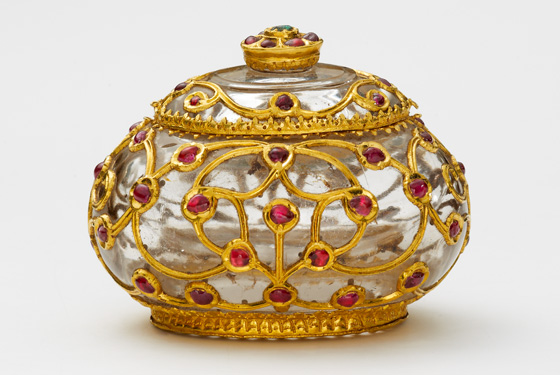 Carved from rock crystal and inlaid with designs in raised gold, with cabochon rubies all over and a central cabochon emerald on the lid in kundan settings. |
