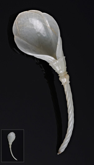 Carved from nephrite jade (translucent pale greenish grey off-white) in the shape of a large leaf, most of which has been rolled and twisted to form the handle.