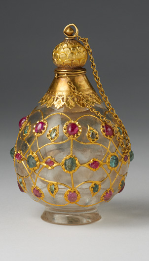 Carved from rock crystal; inlaid with gold in kundan technique and set with rubies and emeralds.