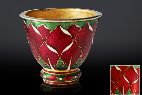 Cup Mughal or Deccan, India 17th Century Height: 3.1 cm Diameter: 3.7 cm Fabricated from gold, with champlevé and painted enamels. Most probably for opium water.
